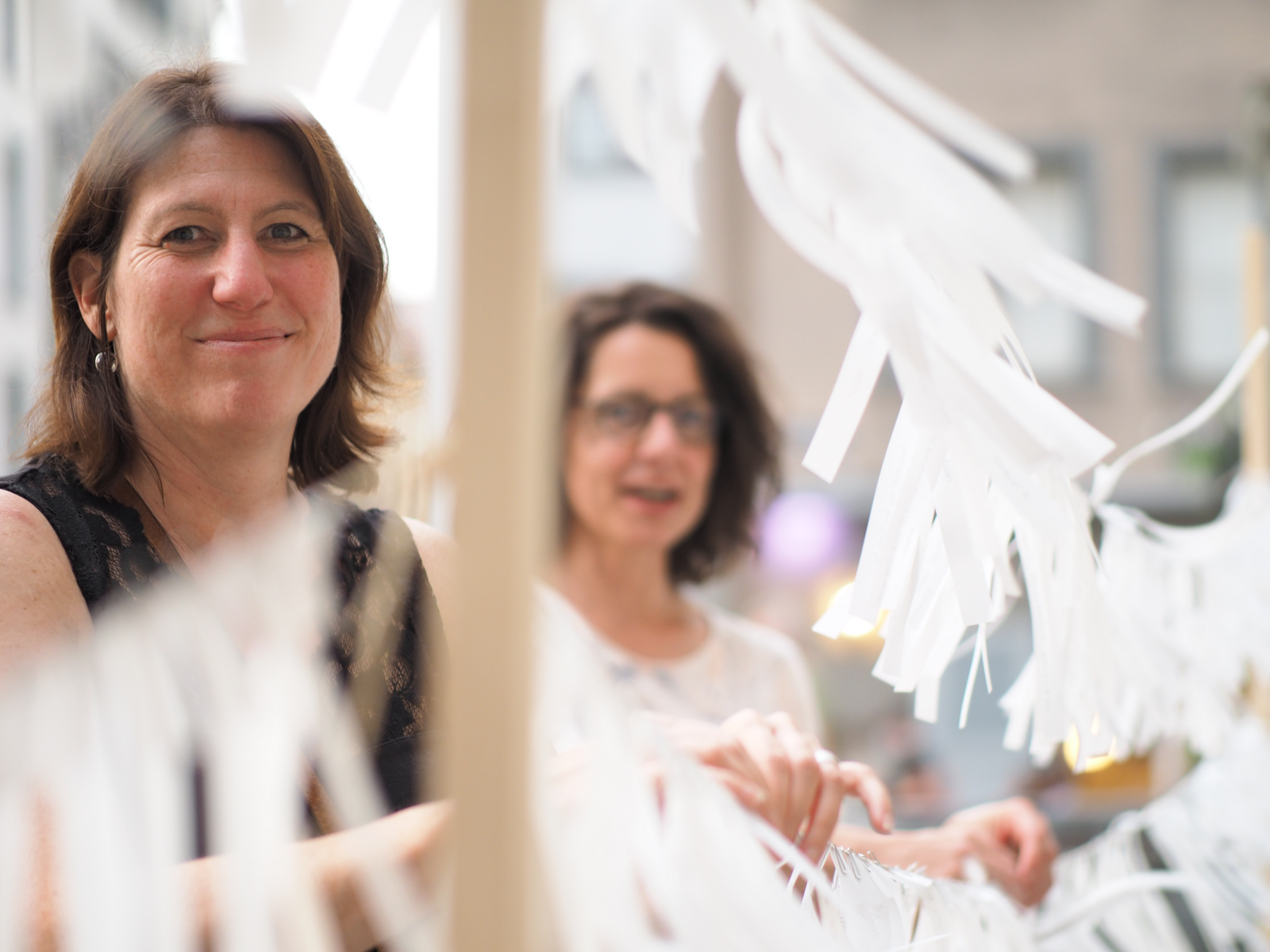 Bild: Stoffstreifen rund um die Churer Martinskirche: Kathrin Mani (Amnesty Internationale) und Rita Gianelli (Fachstelle Migration und Weltweite Kirche).