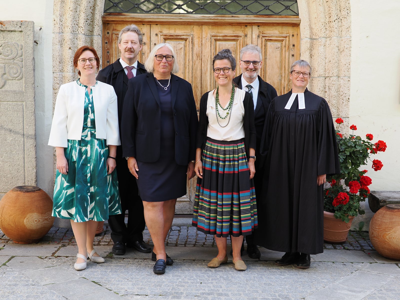 Bild: Willkomm für drei neue Pfarrerinnen. Vordere Reihe von links: Kirstin Schneebeli-Koppelin, Dr. Barbara Hanusa und Noa Yvonne Zenger. Mit im Bild der Dekan Thomas Müller-Weigl mit Vizedekan Albrecht Merkel und Vizedekanin Simone Straub.