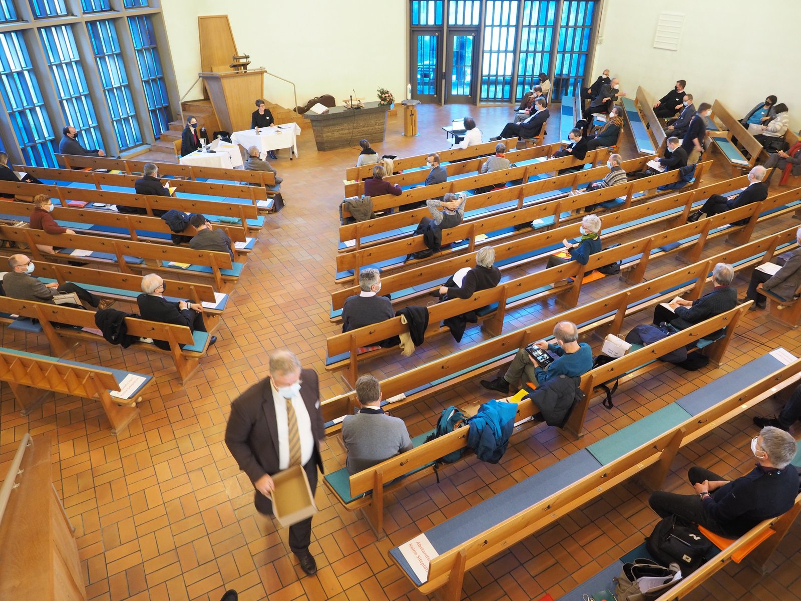 Bild: Synode mit Abstand in der Comanderkirche in Chur. Daheimgebliebene Synodale konnten die Verhandlungen per Livestream mitverfolgen.