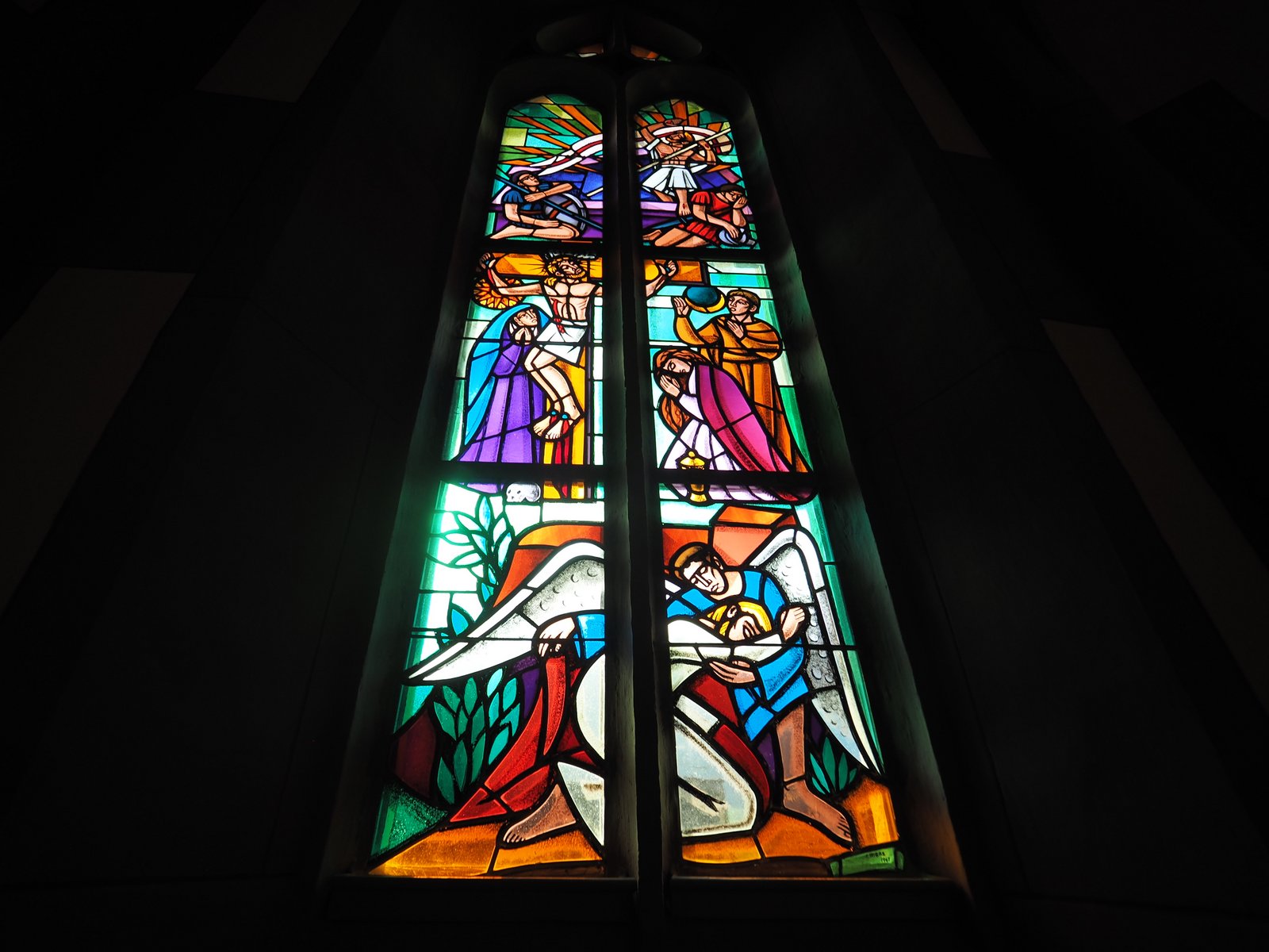 Bild: Die Kreuzigung Jesu. Glasfenster in der Kirche Felsberg.